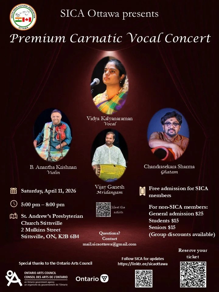 SICA is delighted to present a premium Carnatic concert by Vidya Kalyanaraman (vocal), B. Anantha Krishnan (violin), Vijay Ganesh (mridangam) and Chandrasekara Sharma (ghatam).